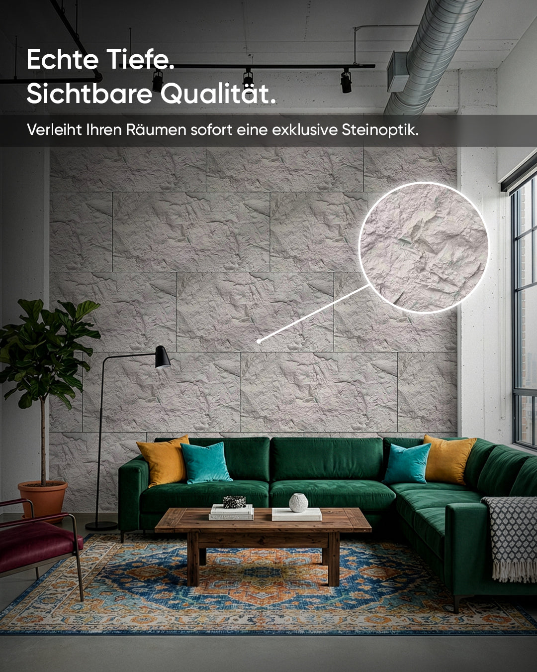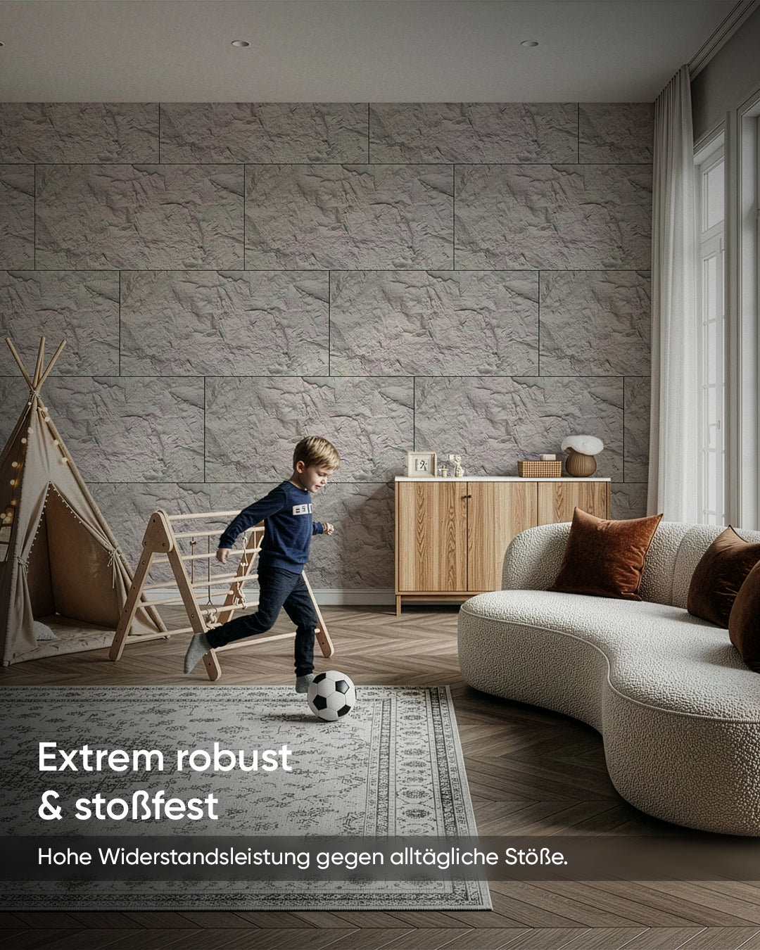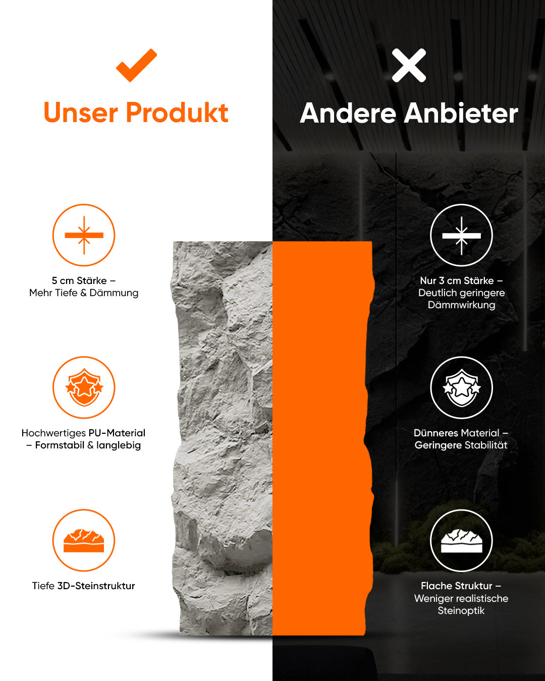Mit einer Materialstärke von 5 cm bieten diese Wandpaneele eine besonders tiefe Struktur. Die ausgeprägte Relief-Oberfläche sorgt für eine realistische Steinoptik und eine starke visuelle Wirkung an der Wand.
