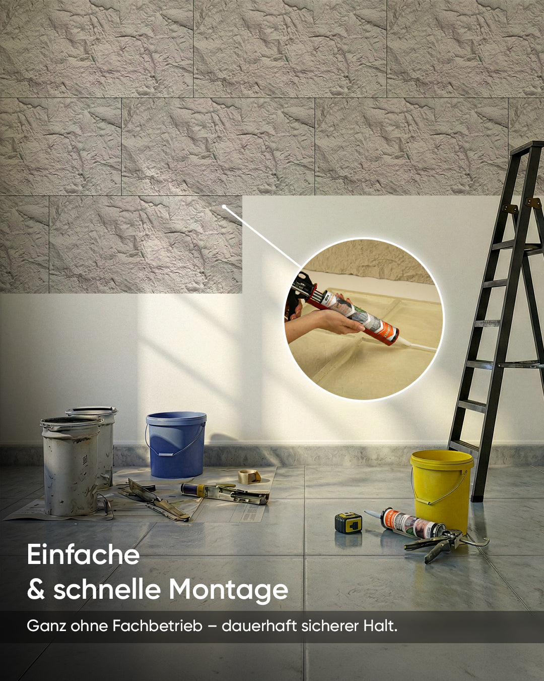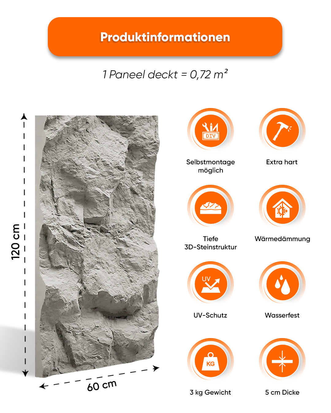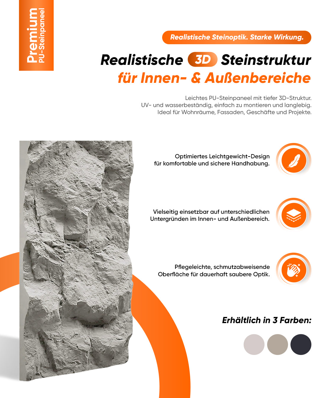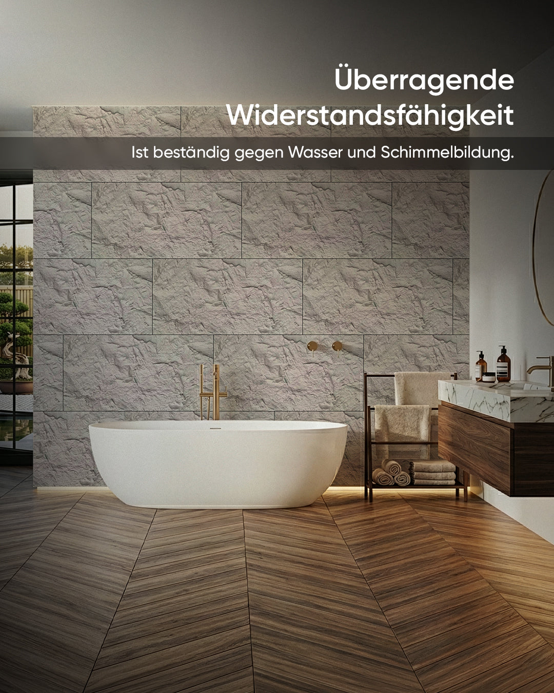 Mit einer Materialstärke von 5 cm bieten diese Wandpaneele eine besonders tiefe Struktur. Die ausgeprägte Relief-Oberfläche sorgt für eine realistische Steinoptik und eine starke visuelle Wirkung an der Wand.